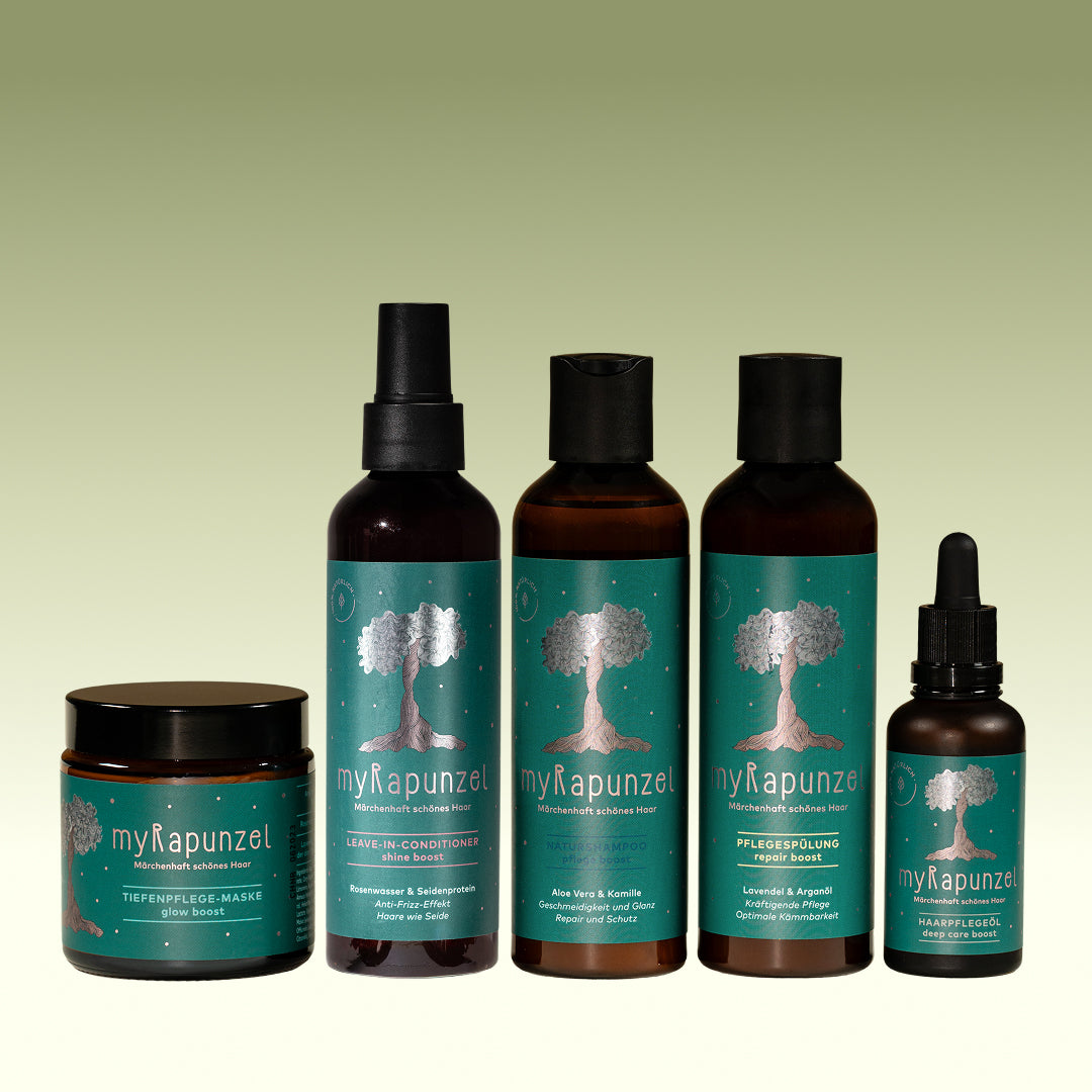 Beinhaltet folgende Produkte: Haarpflegeöl, Pflegeshampoo 200ml, Tiefenpflege-Maske, Leave-in Conditioner, Pflegespülung 200ml